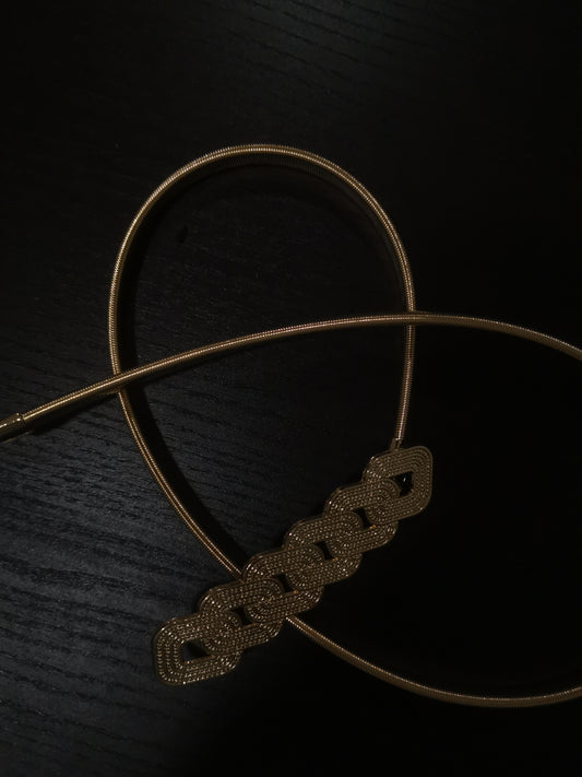 Enhance your look with this stylish accessory set: a sleek leather belt with a polished buckle and an elegant necklace featuring a stunning pendant. Perfect for any outfit.